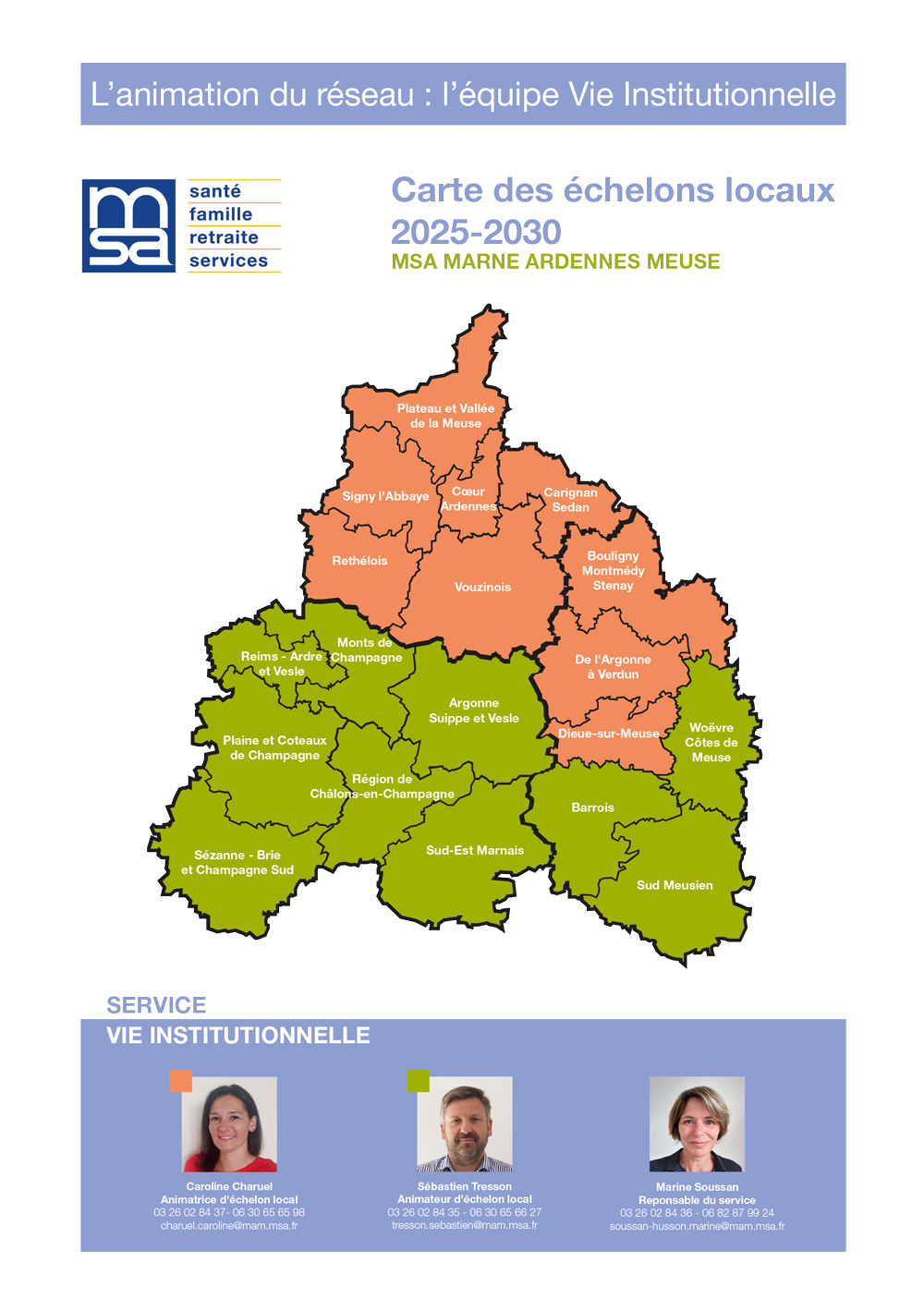 Carte des échelons locaux 2025-2030 et secteurs des animateurs du réseau des élus de la MSA Marne Ardennes Meuse.